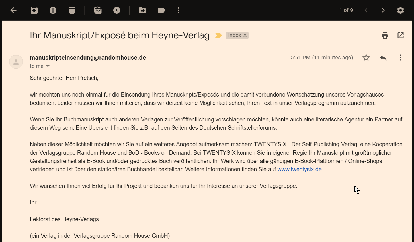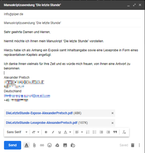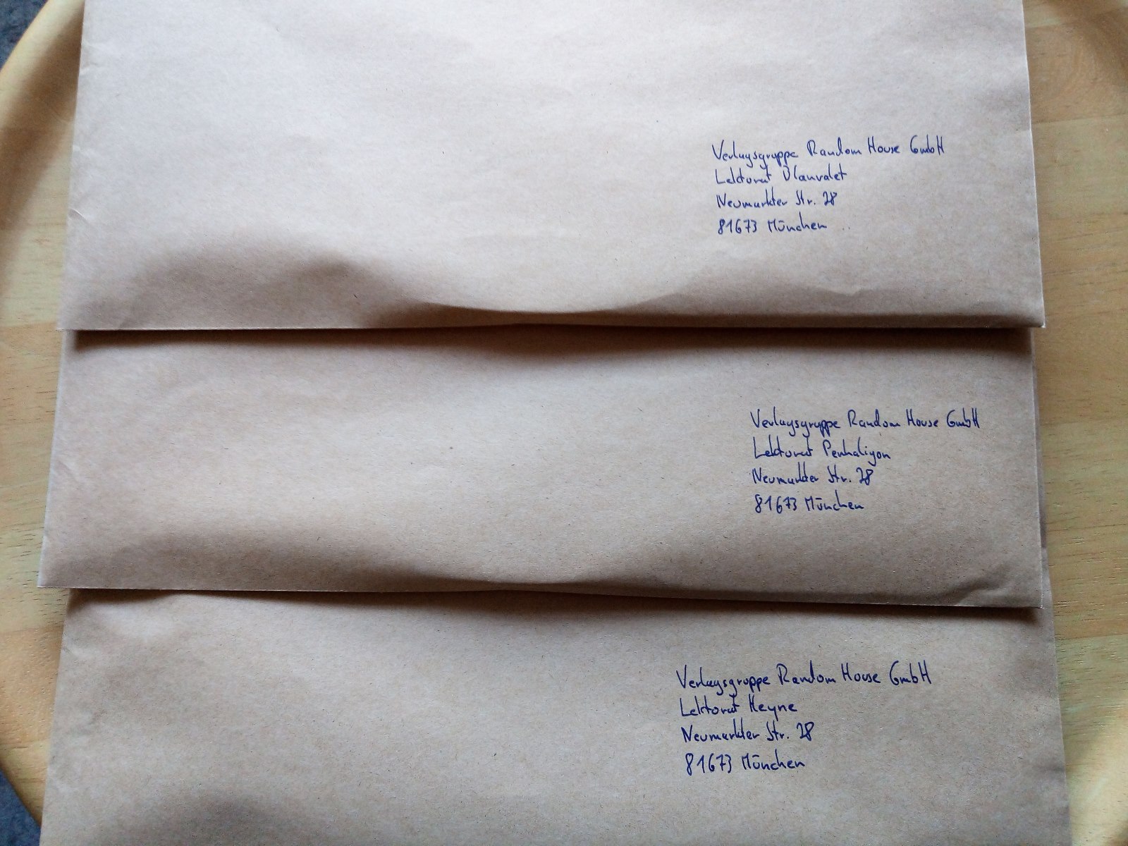 Trotz langer Recherche bin ich wieder bei drei Verlagen der Verlagsgruppe Random House hängengeblieben. Namentlich sind das Heyne, Blanvalet und Penhaligon. Dieses Mal auch dabei der Piper-Verlag, an welchen ich ein digitales Exposè schicken werde.