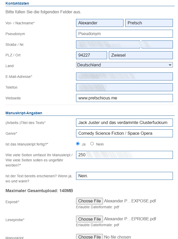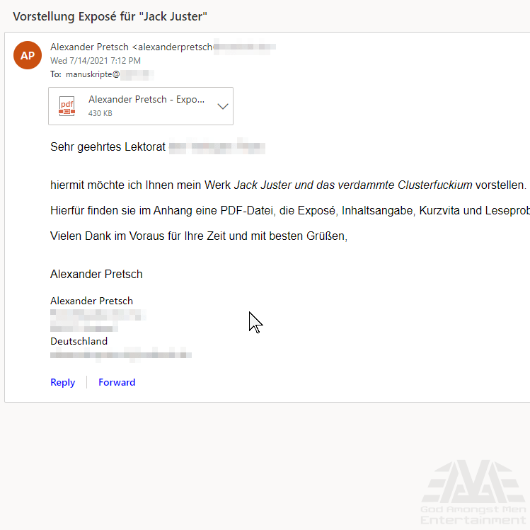 2021! Bei der diesjährigen Verlagssuche versende ich ein Expose meines Werkes »Jack Juster und das verdammte Clusterfuckium«. Nur zwei Verlage kommen in die engere Auswahl, da vor allem die Penguin Random House Group derzeit keine Manuskripte annimmt.