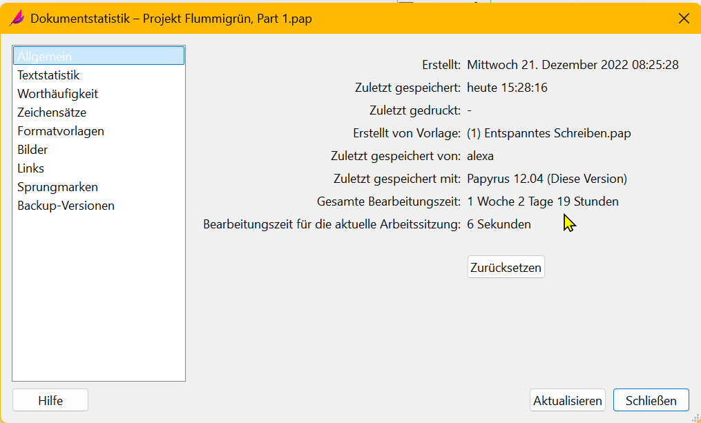 Die große Masse dauerte nur ein knappes Jahr, und erfahrungsgemäß ist der Erstentwurf mies. Als ich aber nach kurzer Ruhezeit die Erstüberarbeitung wagte, war ich überrascht. Bis auf die obligatorische Tilgung von Füllwörtern, Dubletten und Satzumstellungen stieß ich auf keine großen Baustellen.